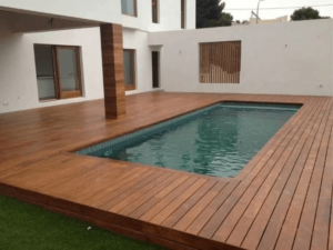 - الخشب الهندسي وهو ألواح معالجة بالبلاستيك المضغوط ومثالية لتغطية المسبح والجلسات المحيطة به.